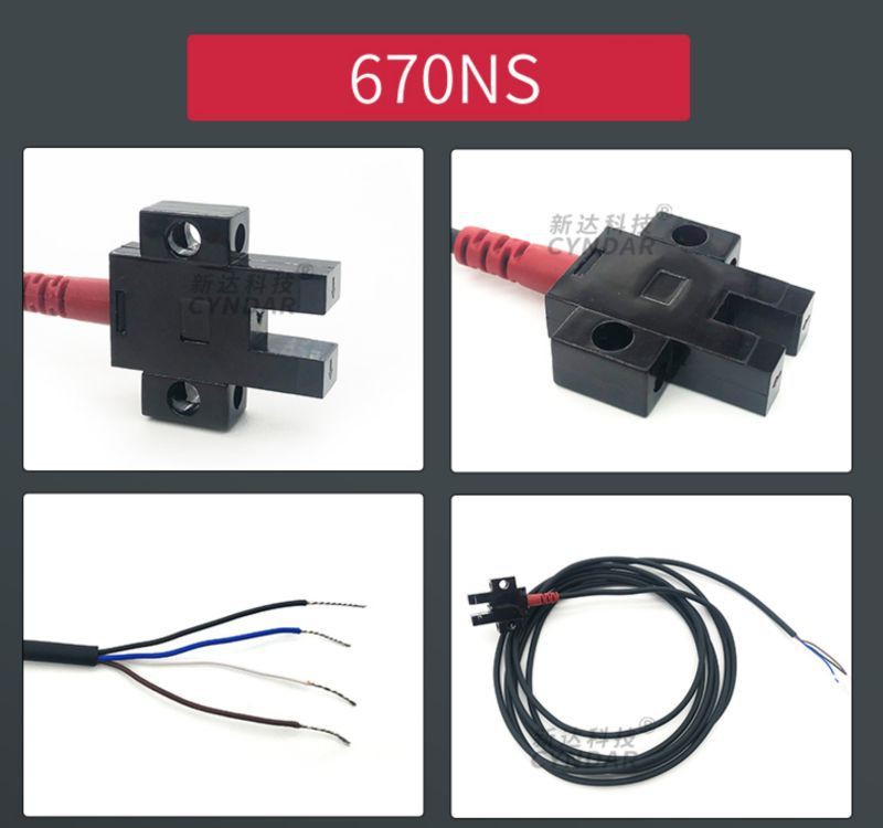 Sakelar fotolistrik tipe slot memiliki keluaran empat kabel, dan warna keempat kabel tersebut adalah coklat, biru, hitam, dan putih. Keempat kabel ini berwarna coklat hingga +V catu daya, biru hingga 0V, hitam dan putih adalah kabel sinyal.